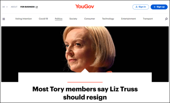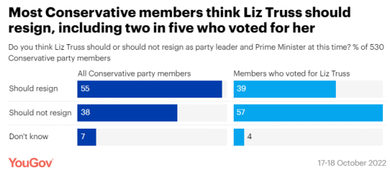 YouGov的这项调查开展于10月17日至18日,受访者为英国530余名保守党成员。调查显示,在特拉斯所属的英国保守党内,有55%的成员希望她能辞职;在当初投票支持特拉斯的人中,认为特拉斯应当辞职的人也有39%之多。