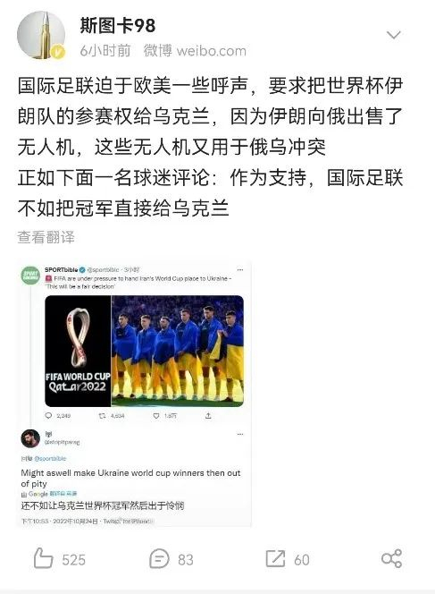 微博有网友发文称,“国际足联迫于欧美一些呼声,要求把世界杯伊朗队的参赛权给乌克兰,因为伊朗向俄出售了无人机,这些无人机又用于俄乌冲突。正如下面一名球迷评论:作为支持,国际足联不如把冠军直接给乌克兰。”