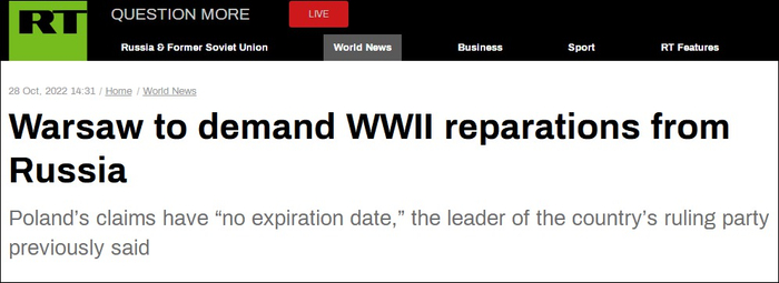 今日俄罗斯称,这个想法对波兰保守派政客来说并不新鲜。执政党法律与公正党领导人雅罗斯瓦夫·卡钦斯基(Jaroslaw Kaczyński)2020年向德媒表示,在讨论波兰向德国提出的赔偿时,俄罗斯也将不得不支付赔偿。他说,自己不指望俄罗斯会很快给他们钱,但波兰的怨念“不存在保质期”。