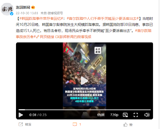 韩国踩踏事件幸存者回忆:首尔踩踏中人们手牵手哭喊至少要活着出去