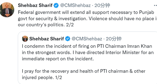 巴基斯坦总理夏巴兹刚刚发推,强烈谴责巴旁遮普省沃济拉巴德发生的枪击事件。