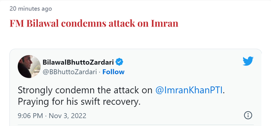 巴基斯坦前总理伊姆兰·汗11月3日在一场活动中遭枪击。据巴基斯坦《黎明报》报道,巴基斯坦外长比拉瓦尔刚刚发推称,“强烈谴责袭击伊姆兰·汗的行为,祈祷他早日康复”。
