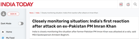 《今日印度》:印度对巴基斯坦前总理伊姆兰·汗遇袭后的第一反应,是密切关注局势