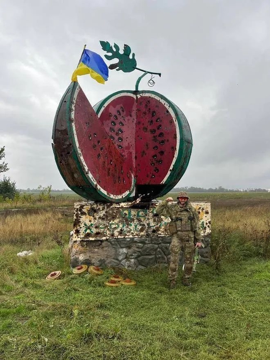乌军夺下赫尔松部分地区后,在西瓜雕塑前留影