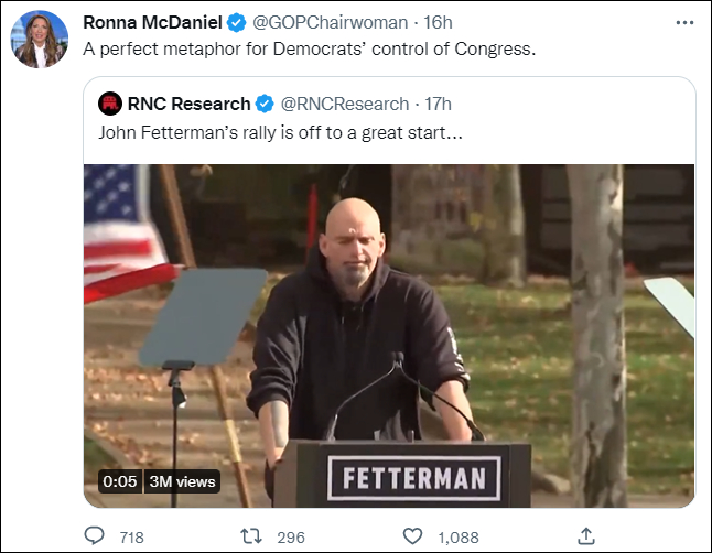 共和党全国委员会研究小组推特账号也嘲笑称:“约翰·费特曼的集会有了一个良好的开端……”