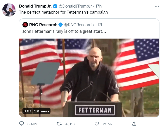 一些保守派用户开始调侃这是费特曼选举之路的不祥之兆,如小唐纳德·特朗普(Donald Trump Jr。)就称这一场景是对“费特曼竞选活动的完美隐喻”。
