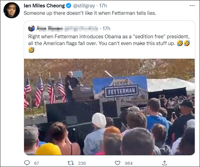 推特上的视频也显示,在费特曼开始介绍奥巴马时,他身后的美国国旗就时而随风小幅度飘动;而在他说完“我很自豪能和100%没有煽动性言论或行为的总统站在一起”时,活动现场的风突然变得强劲起来,并随即吹翻了费特曼身后的一排美国国旗。据追踪风速和其他天气现象的网站WillyWeather介绍,匹兹堡当日经历了一次大风天气,在费特曼竞选活动期间,风速超过了20英里/小时。