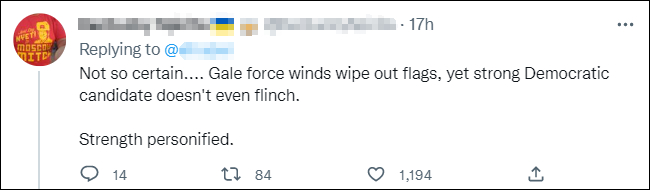 而支持民主党的网民还借机吹捧称:“强风刮倒了旗帜,但强大的民主党候选人却丝毫没有退缩。力量的化身。”