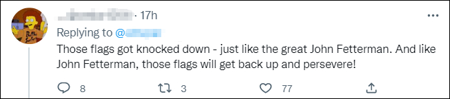 另一位费特曼的支持者也宣称:“那些旗帜被击倒了——就像伟大的约翰·费特曼一样。但和约翰·费特曼一样,这些旗帜会重新升起并坚持下去!”