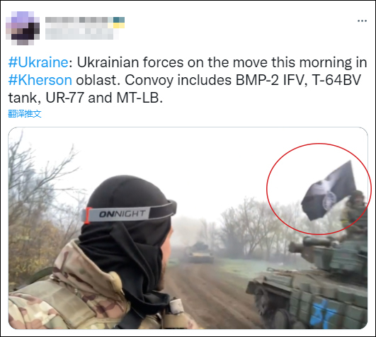 此外,推特上的一段视频显示,乌军向赫尔松前进时,一辆坦克上悬挂着一面黑色旗帜,该旗帜带有纳粹德国纳粹鹰图案,鹰爪抓着黑太阳。RT指出,这种符号在“新纳粹分子”中非常流行,并被纳入新纳粹军事组织“亚速营”的徽章中。