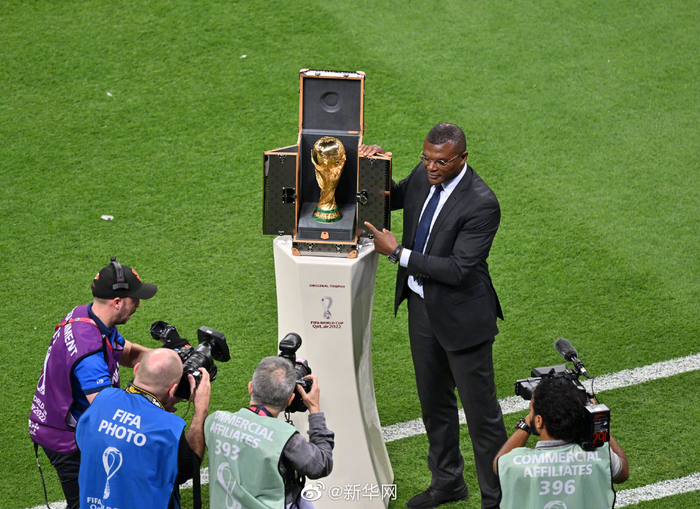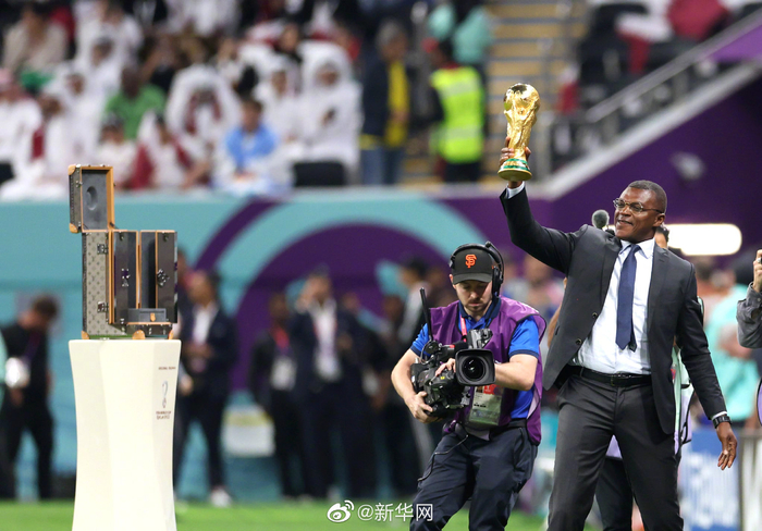 #2022卡塔尔世界杯开幕式举行#【#大力神杯进入海湾球场#】11月20日,法国队名宿德塞利在海湾球场展示大力神杯。