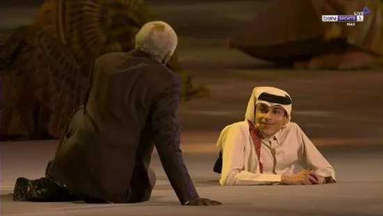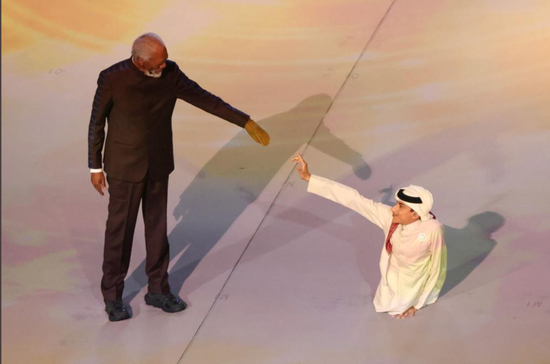 在开幕式表演的上半段,85岁的摩根·弗里曼走向穆夫塔,盘腿坐下。聚光灯下,一黑一白的两个身影就这么席地对坐,畅谈着美好和平的未来。