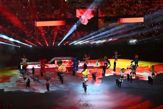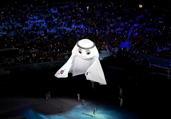 几分钟后,本届世界杯吉祥物拉伊卜出现在现场大屏。它的造型来源于阿拉伯头巾,意思是“技艺高超的球员”。