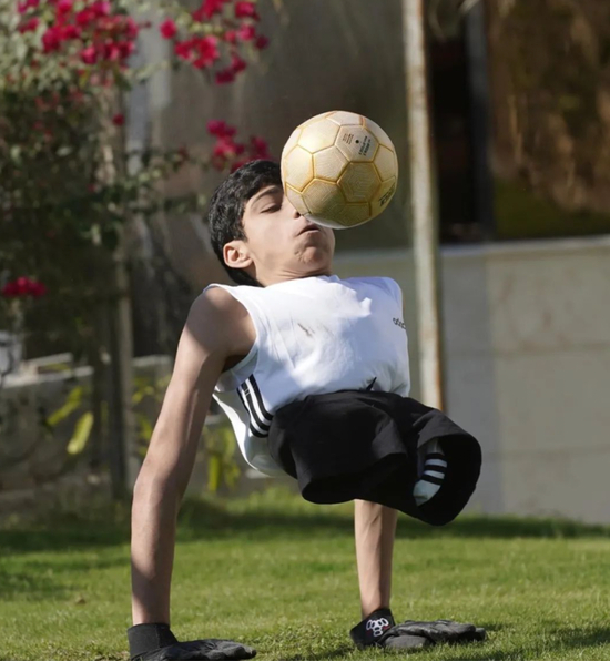 足球是他最最最喜爱的运动。只有上半身?没关系,他将球鞋穿在自己的手上,在绿茵场上“奔跑”、防守、颠球↓↓