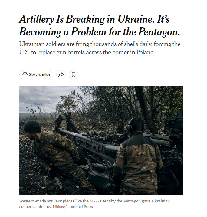 [#西方援乌大炮三分之一已无法使用#]《纽约时报》11月27日报道了乌军火炮的磨损情况。乌克兰军队使用了大量西方援助的火炮,这些火炮每天向俄军发射数千枚炮弹。但乌军的频繁使用带来了损耗,据美国和乌克兰官员说,美国向乌克兰援助的350门西方榴弹炮在几个月的过度使用后正在耗尽,有三分之一的火炮已经无法使用。