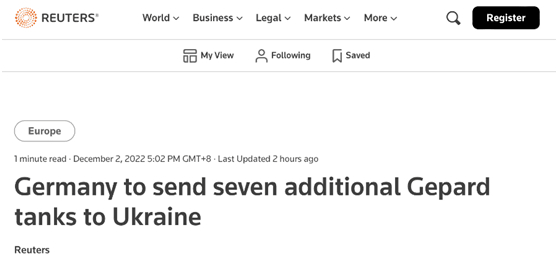 【环球网报道】据路透社12月2日报道,德国政府网站发布消息称,德国正在准备向乌克兰额外提供7辆德国“猎豹”防空坦克。路透社还提到,德国总理朔尔茨8月时曾在德国奥尔登堡一处军事训练基地视察乌克兰士兵训练使用这种武器。他当时在一辆“猎豹”防空坦克前留影。