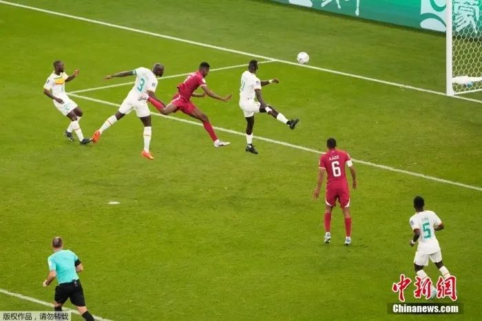 当地时间11月25日,世界杯小组赛第二轮A组,东道主卡塔尔队对阵塞内加尔队的比赛打响。图为卡塔尔球员穆罕默德·蒙塔里破门瞬间。