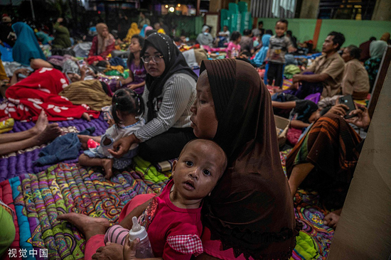 当地时间2022年12月4日,印度尼西亚东爪哇省,塞梅鲁火山喷发后,人们在坎迪普罗村一个社区大厅的房间里临时躲避。