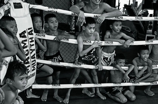 在搏击台四周明亮的灯光下,准备战斗的男孩几乎看不到围绕着拳台四边的绳索。台下拥挤的人群如同蠢蠢欲动的火山,制造出一种类似节日的氛围。
