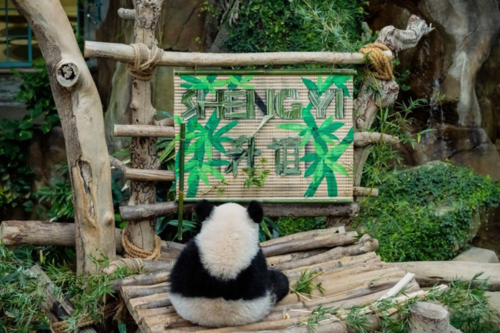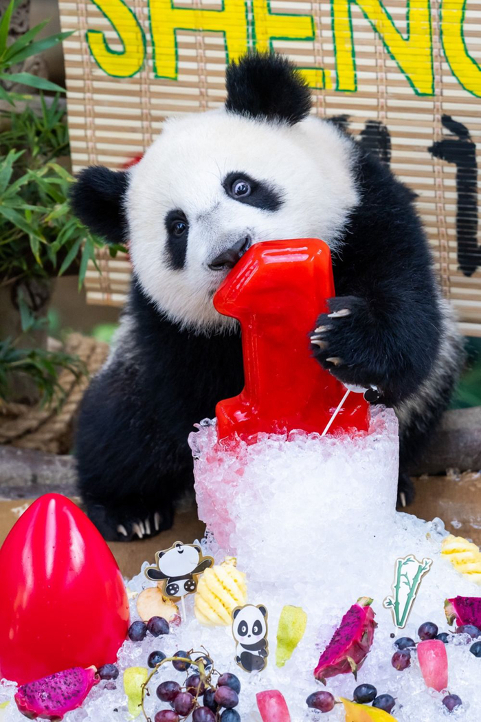 ↑2022年5月31日,大熊猫宝宝“升谊”在马来西亚吉隆坡附近的国家动物园庆祝一岁生日。