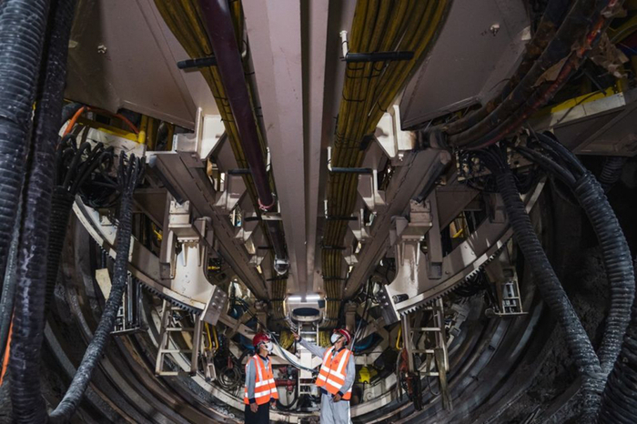↑2022年4月29日,在马来西亚文冬附近的马来西亚东海岸铁路项目云顶隧道施工现场,敞开式硬岩隧道掘进机(TBM)维保组负责人赵东(右)和操作员王恒阳查看设备。