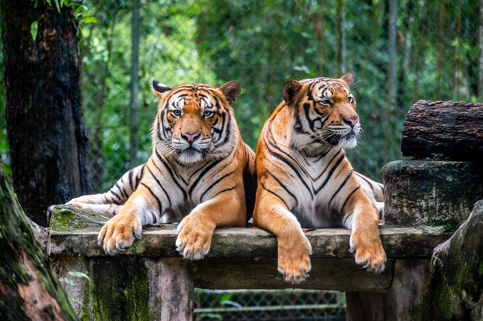↑这是2022年2月27日在马来西亚吉隆坡附近的国家动物园拍摄的马来亚虎“威拉”(左)和“黑霸”。