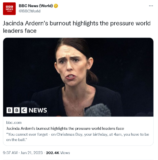 在这篇题为“杰辛达·阿德恩的过劳反映出世界领导人面临的压力”的文章中,BBC首先表示阿德恩在宣布辞职的讲话中就已经明确透露了她的精力已经耗尽的意思。