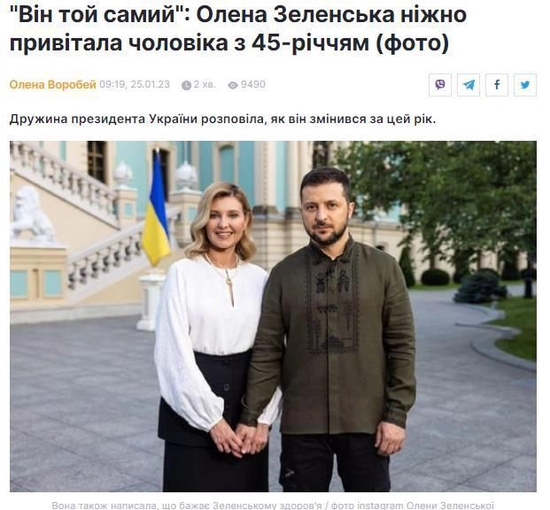 中新网1月25日电 据乌克兰媒体报道,1月25日是乌克兰总统泽连斯基45岁生日,乌总统夫人叶莲娜·泽连斯卡娅第一时间在其社交媒体账户上为丈夫送上生日祝福。