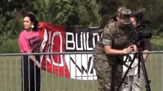 启用仪式当天,在会场旁,当地反战人士举着横幅抗议基地启用,担心这将使关岛重新卷入战争。