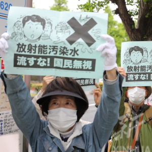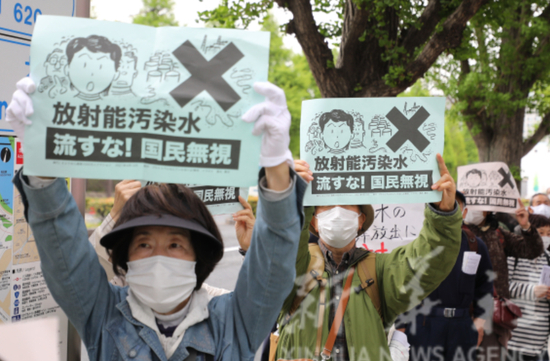 2021年4月13日,抗议者在日本东京的首相官邸外反对福岛核污水排入大海。