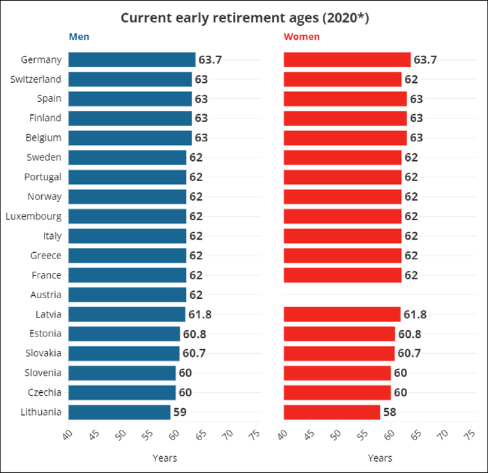 据欧洲新闻台统计,尽管欧洲各国对退休年龄的规定不尽相同,但大多在62岁左右,包括瑞典、葡萄牙、挪威、意大利、希腊和奥地利。其中,德国的退休年龄规定相对较高,平均约为63.7岁。