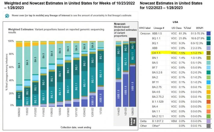 [#超60国发现新冠新毒株CH.1.1#]1月30日,根据美国疾病控制与预防中心(CDC)最新数据,美国疾病控制和预防中心正在追踪名为CH.1.1 的新冠新毒株。CH.1.1占美国病例的1.5%,占比位列第五。