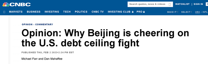 最后值得一提的是,就在这项投票开始前,美国消费者新闻与商业频道(CNBC)曾刊登了一篇文章,大意是美国两党不去想着尽快解决债务上限问题,以此增强美国的竞争力,而是只顾着搞政治互撕,会让中国这个美国的“竞争对手”看笑话的。