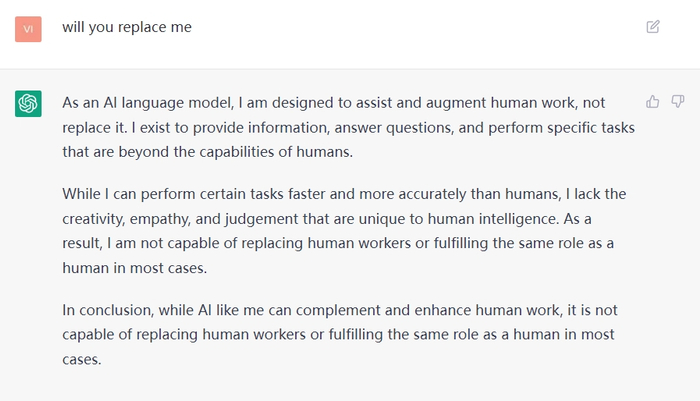 至于是否会“取代人类”,ChatGPT有些自知之明:“作为一个人工智能语言模型,我是被设计出来帮助人类工作的,不是取代。我提供信息、回答问题,并做一些超出人类能力的特定任务。虽然我可以比人类更快或更准确,但我缺乏人类智慧特有的创新、同情心和判断力。”