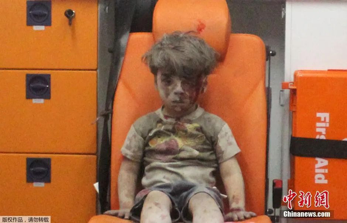 “白头盔”拍下的叙利亚男童奥姆兰的照片,他满面灰尘、脸部有血迹。