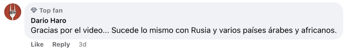 阿根廷网友达里奥·哈罗说:“感谢这条视频,他们正在针对俄罗斯做类似的抹黑,以及针对很多阿拉伯和非洲国家。”