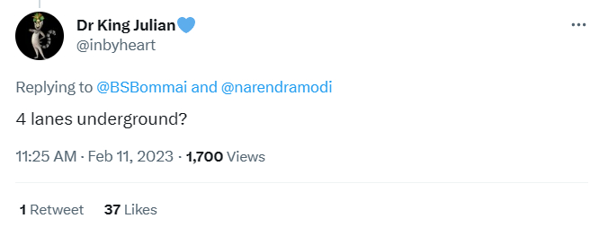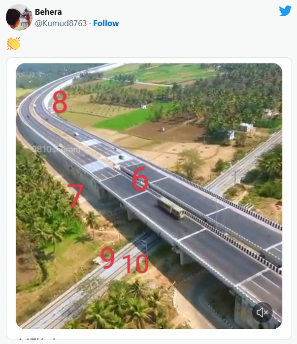 “多美的景色啊!10车道的班加罗尔-迈索尔高速公路,旁边是范德·巴拉特快车,描绘了卡纳塔克邦的世界级基础设施和前所未有的增长。在莫迪总理领导下,我们的双引擎政府在这个邦创造了奇迹。”然而下方配图显示,高速公路只有6条车道。