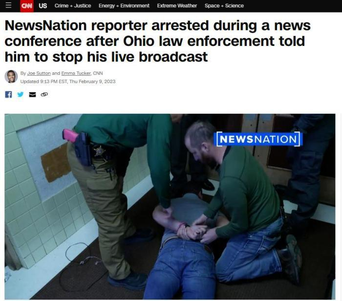 当地时间8日,在俄亥俄州政府就列车化学品泄漏事件召开的新闻发布会上,“新闻国家”媒体(NewsNation)非裔记者埃文·兰伯特在州长讲话时,被要求停止现场报道。原因是兰伯特当时“声音很大,具有破坏性”。