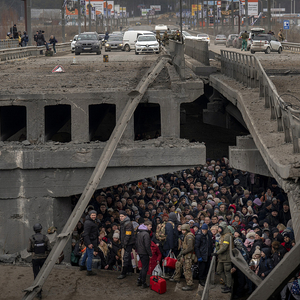 当地时间2022年3月5日,乌克兰基辅,乌克兰人挤在一座被毁的桥下,试图穿越伊尔平河逃离