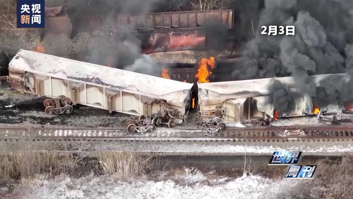 美国媒体注意到,此前的2月3日,美国俄亥俄州东巴勒斯坦镇发生“毒火车”出轨事件,造成生态灾难,焚烧废料散发致命物质。