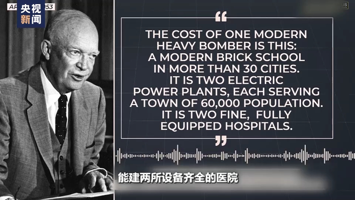 时任美国总统 艾森豪威尔:一架现代重型轰炸机的成本是这样的,可以在30多个城市各建造一所现代化的砖房学校,可以建两座发电厂,分别为一座6万人口的城镇提供服务,能建两所设备齐全的医院。