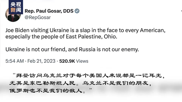 和党众议员保罗·戈萨尔也在推特上写道,“拜登访问乌克兰对于每个美国人来说都是一记耳光,尤其是东巴勒斯坦人民。乌克兰不是我们的朋友,俄罗斯也不是我们的敌人。”
