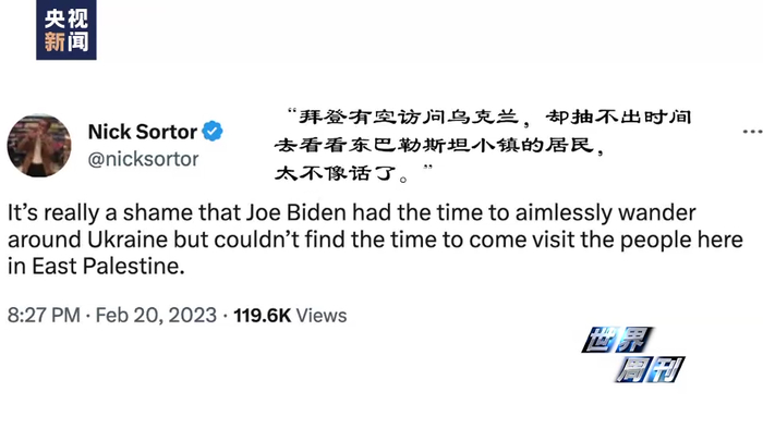美国俄亥俄州东巴勒斯坦市长 科纳威:这是给我们最大的一记耳光,告诉我们,拜登根本不在乎我们,他明明可以派遣任何他想派的组织机构到我们这儿。但他不光没有这么做,而我今天早上在新闻中发现,他到了乌克兰,给那里的人送了数百亿美元,而不是给我们,我对此很愤怒。
