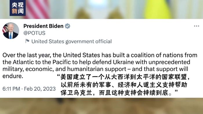 “美国建立了一个从大西洋到太平洋的国家联盟,以前所未有的军事、经济和人道主义支持帮助保卫乌克兰,而且这种支持会持续到底。”
