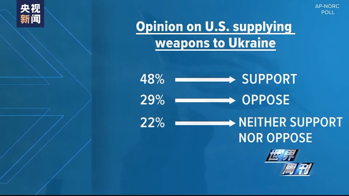 据美联社和NORC公共事务研究中心联合进行的最新民调显示,如今,只有48%的美国人支持对乌克兰提供军事援助,较去年4月时的73%出现了明显下滑。