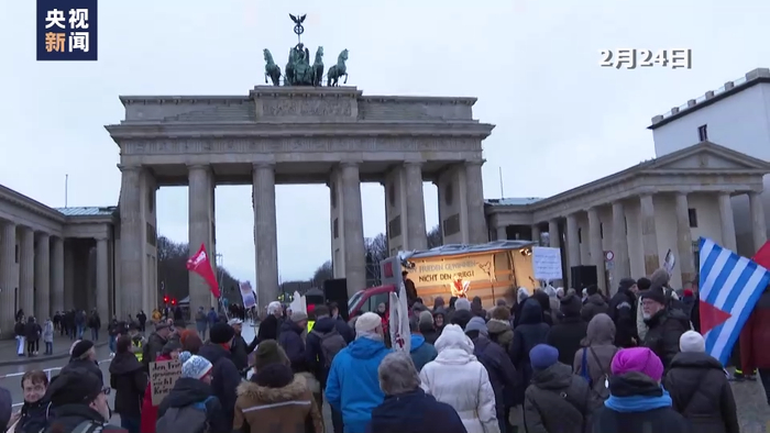 当地时间2月24日,德国柏林勃兰登堡门,很多爱好和平的人聚集于此,呼吁和平解决乌克兰危机。
