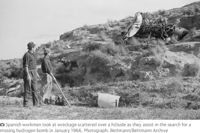 这起氢弹掉落事故发生在1966年1月17日,当时一架美国B-52轰炸机和一架加油机相撞,导致11名机组人员中的7人死亡,地面上没有人员伤亡。当时正值美苏冷战时期,美国让搭载核武器的军机持续在靠近苏联边境的空中飞行。