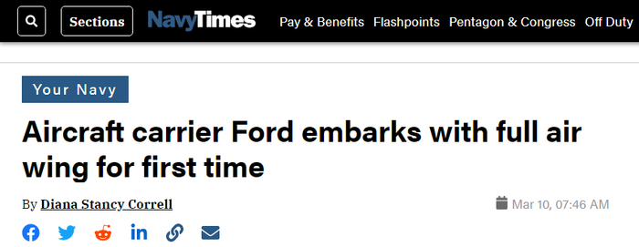 先来看看“福特”号航母的最新进展。《海军时报》称,该航母在去年的短暂部署期间,配备了约80%的舰载机联队,包括“超级大黄蜂”战斗机、E-2D“高级鹰眼”预警机、EA-18G“咆哮者”电子攻击机以及MH-60“海鹰”直升机等主要舰载机型号。