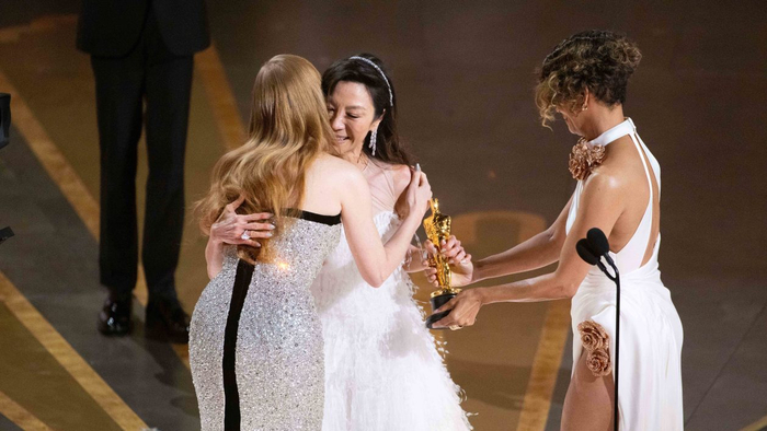 在颁奖典礼上,现场摄影师捕捉到杨紫琼、哈里·贝瑞和杰西卡·查斯坦三位“不同肤色影后”的合影瞬间在网络上热传,被视作好莱坞近年来一直试图多元化、多样性的缩影。今年奥斯卡舞台上还有其他亚裔面孔:主办方邀请中国动作巨星甄子丹现场介绍许玮伦(《瞬息全宇宙》女配角)表演提名歌曲,而最终获得奥斯卡最佳原创歌曲的是印度“托莱坞”大片《RRR》的主题曲《Naatu Naatu》。此外,关继威领奖时与1984年他在电影《夺宝奇兵2》中的忘年交哈里森·福特跨越39年的世纪拥抱,也成为颁奖礼上的感人一幕。