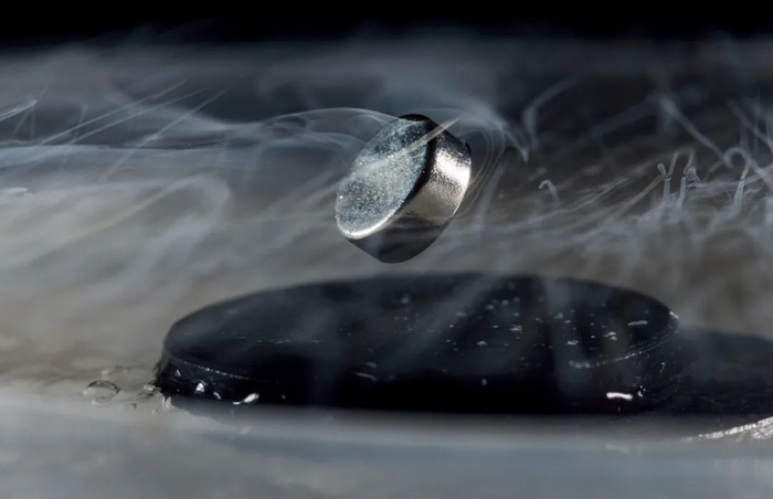 兰加·迪亚斯演示的一次实验中,一块磁铁漂浮在液氮冷却的超导体上。图/罗彻斯特大学